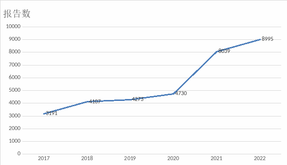 2022年度全省共收到《化妆品不良反应/事件报告表》8995份,与2021年度相比,增长11.89%(见图1-1)。其中一般报告8985份,严重报告10份。每百万人口平均报告数155份。2017至2022年,报告总体呈递增趋势。