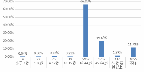 2022年收到的化妆品不良反应/事件报告信息显示,患者/消费者年龄主要集中在16-44岁、45-64岁,其中16-44岁的患者/消费者5957例,占66.23%;45-64岁的患者/消费者1752例,占19.48%;0-12岁的患者/消费者96例,占1.06%。未填写患者/消费者年龄报告1055份,占11.73%,较2021年下降8.17%,提示报告质量有所提高。(见图1-4)