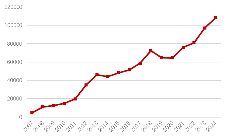 2007-2024年,国家药品不良反应监测系统湖北省报告数持续增长,目前累计数据收到91万份,详见图1。