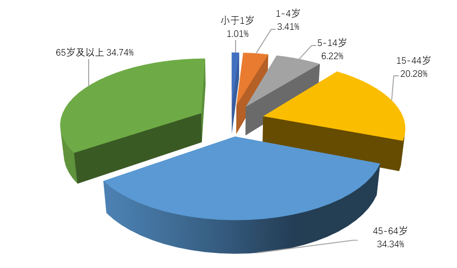患者男女比例为0.80:1,略高于总体报告。年龄分布构成比从高到低依次为中年期患者(占比33.56%)、老年期患者(占比33.32%)、青壮年期患者(占比21.29%)及14岁以下儿童(占比11.83%)。
