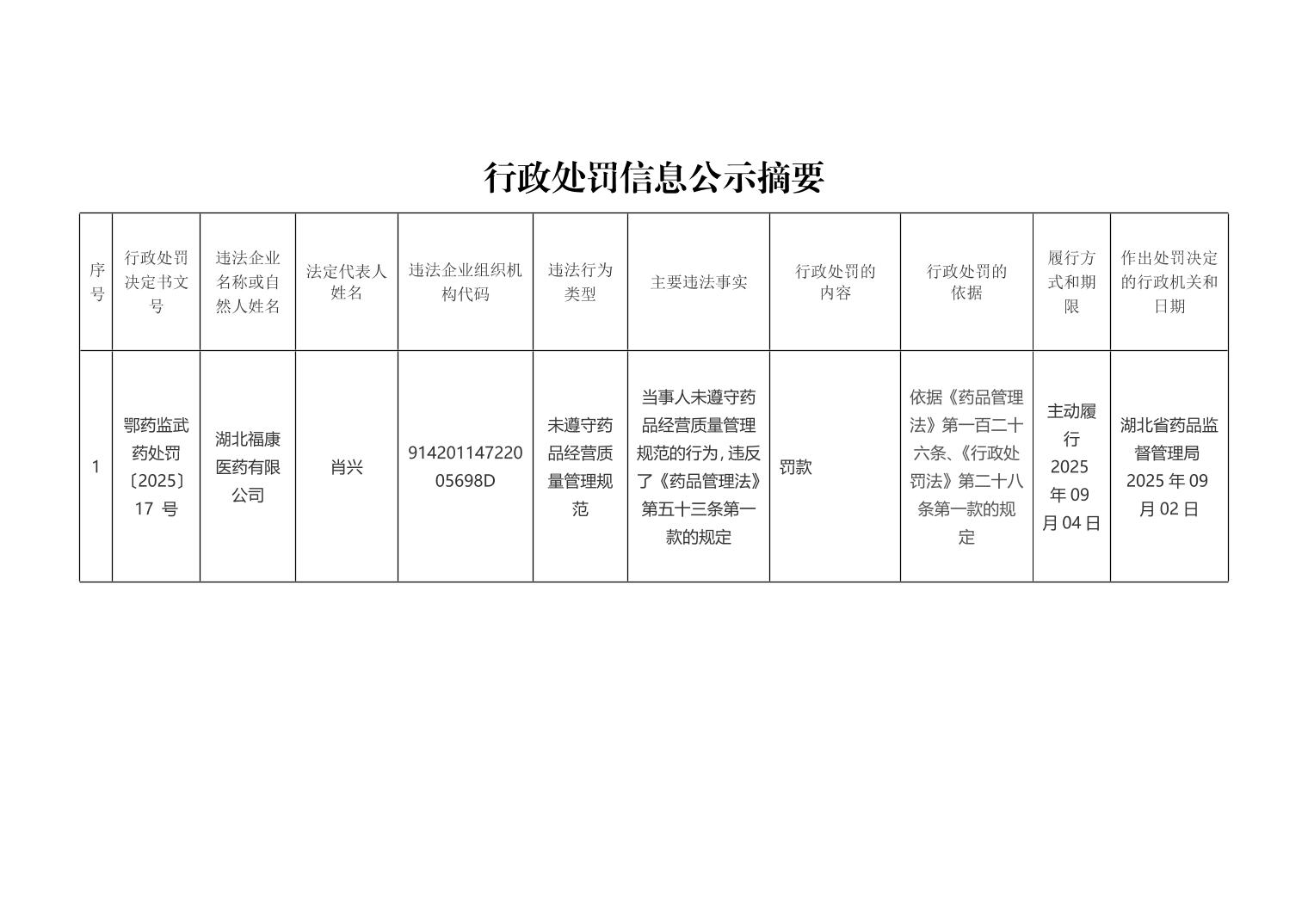行政处罚信息公示摘要(湖北福康医药有限公司)
