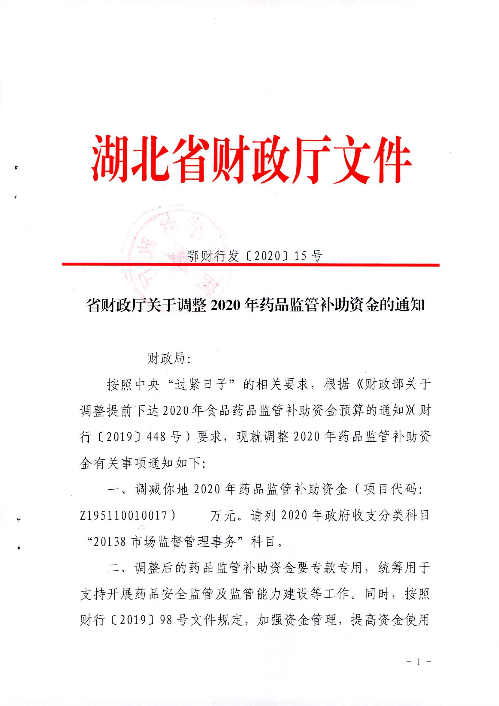省财政厅关于调整2020年药品监管补助资金的通知