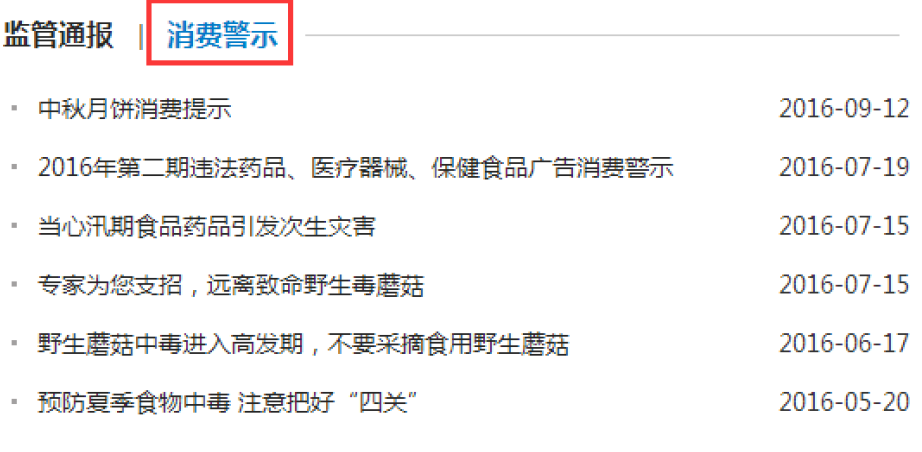 (三)加强消费警示信息公开。依据季节性、区域性、节假日等不同情况的消费特点,有针对性地发布食品药品安全消费警示信息,加强对消费者的权益保护。及时公开严重违法食品药品广告信息、非法销售食品药品的网站信息。共公开9期,包括“中秋月饼消费提示”“违法药品医疗器械保健食品广告消费警示”“当心汛期食品药品引发次生灾害”“野生蘑菇中毒进入高发期,不要采摘食用野生蘑菇”“预防夏季食物中毒注意把好四关”“享受订餐便捷切勿忽视安全”等。