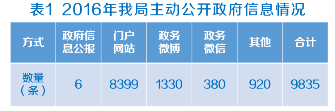 2016年,我局共主动公开政府信息9835条。其中,政府公报公开6条,门户网站公开8399条,政务微博公开1330条,政务微信公开380条,其他方式公开920条。